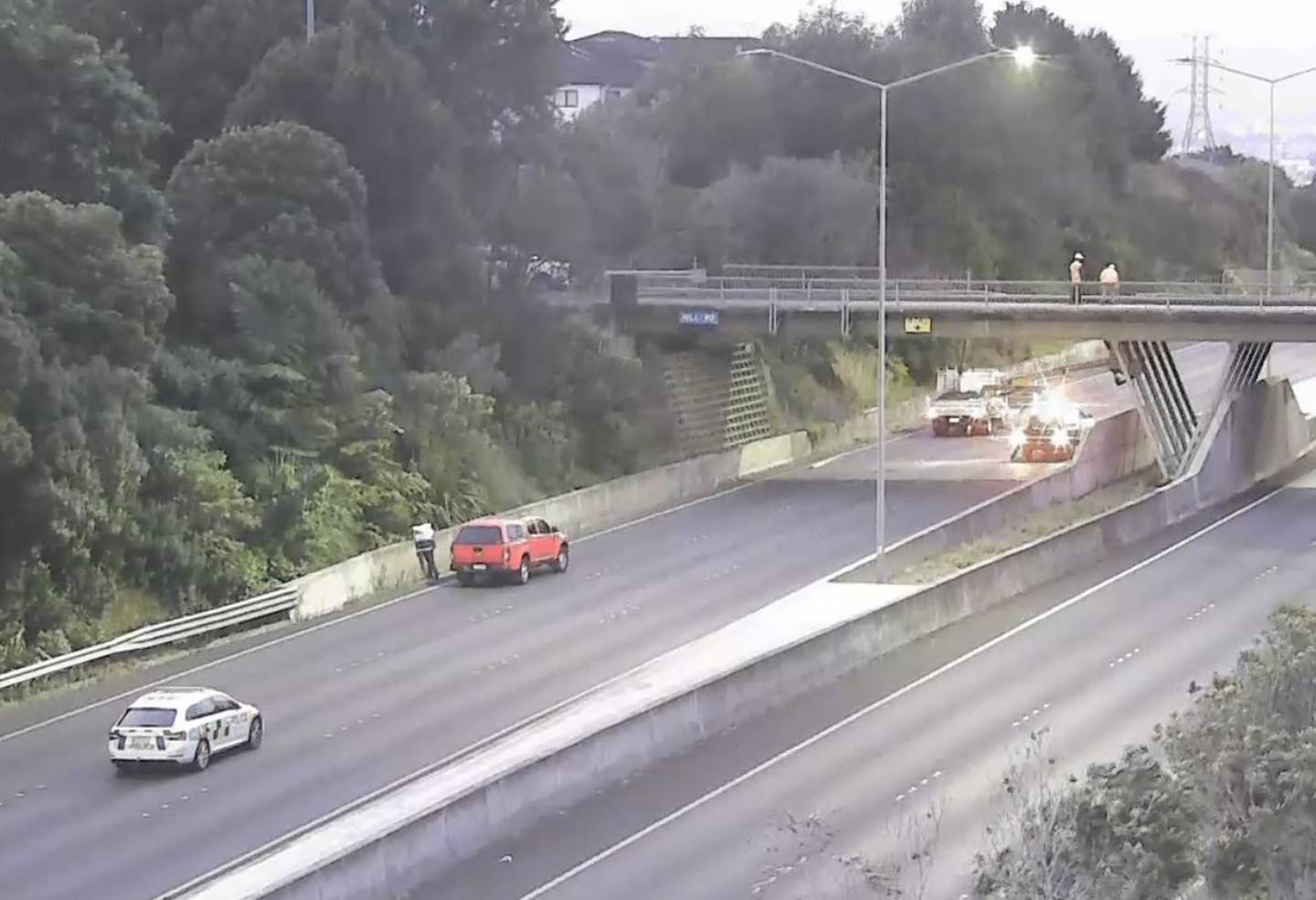 A section of Auckland's Southern Motorway is closed this morning after a vehicle crashed through the barriers on an overbridge, plunging to the motorway below.Â