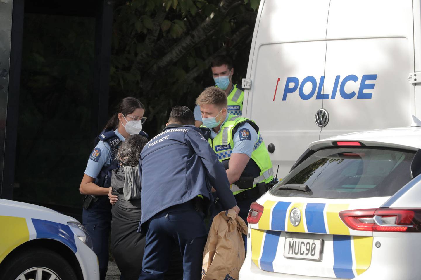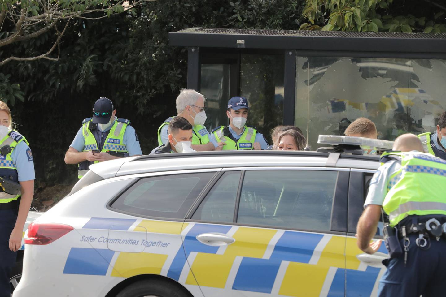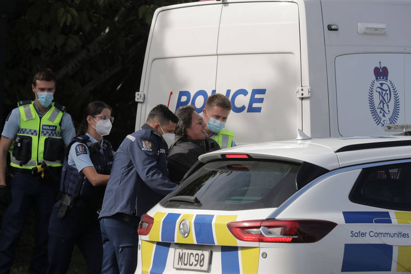 There was evidence of a smashed-up police van and a "wailing" woman was taken into custody at Onepoto Domain near the entrance to State Highway 1 on Auckland's North Shore around 11am.