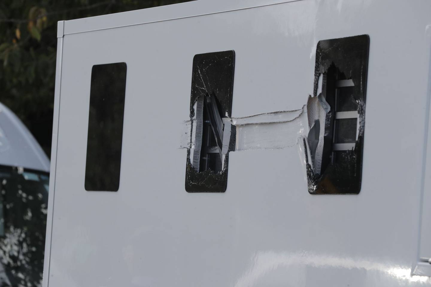 A smashed police vehicle at the scene. Photo / Michael Craig