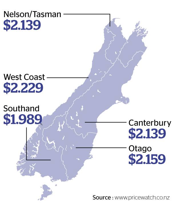 While lowest prices in the North Island regularly dip below $2 per litre for 91, the South Islander have to dig a little deeper to afford prices in excess of $2.