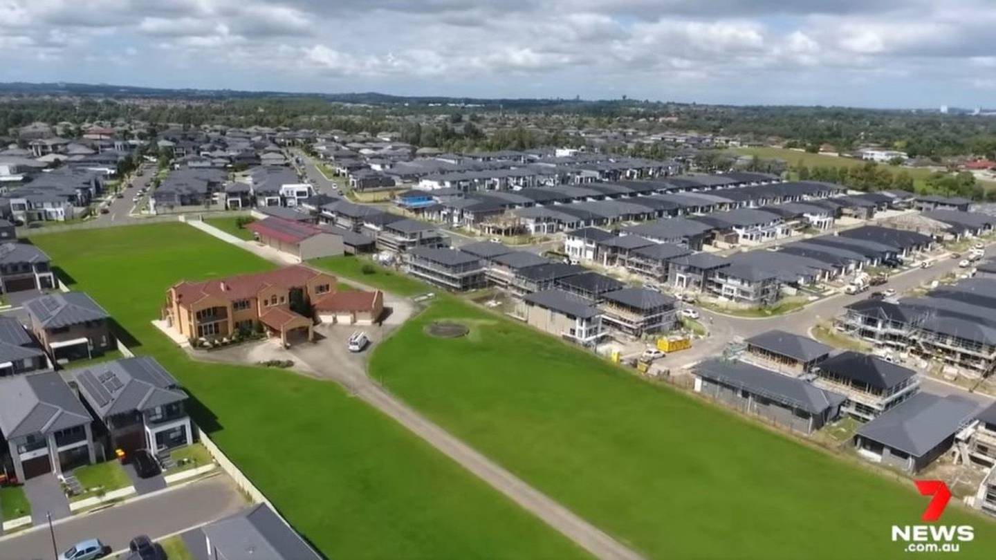 Drone shots of the property really show how much it stands out among the lines of grey two-storey homes. Photo / Seven NewsÂ