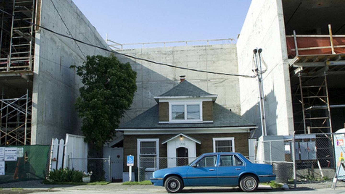 Developers continued with their project by building around the home, leaving it surrounded by concrete walls.Â