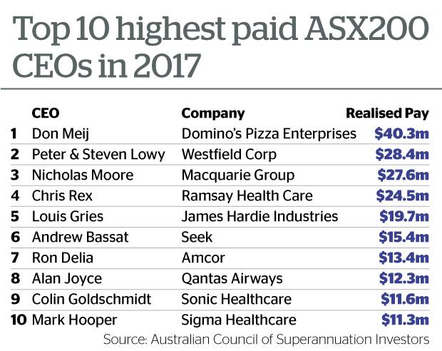 The report found the highest paid CEO for the ASX200 was the Domino's Pizza chief executive Don Meij who received realised pay of A$36,837,702 ($40.4m).