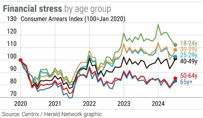 Figures from credit bureau Centrix show financial stress levels for those between 30-49 years old have been climbing since May.