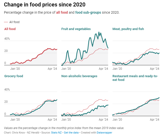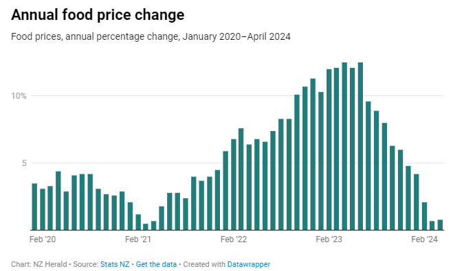 The smaller increase compared with last year was due to cheaper fruit and vegetables, down 13 per cent in the 12 months to April 2024, while all other broad food groups increased in price.