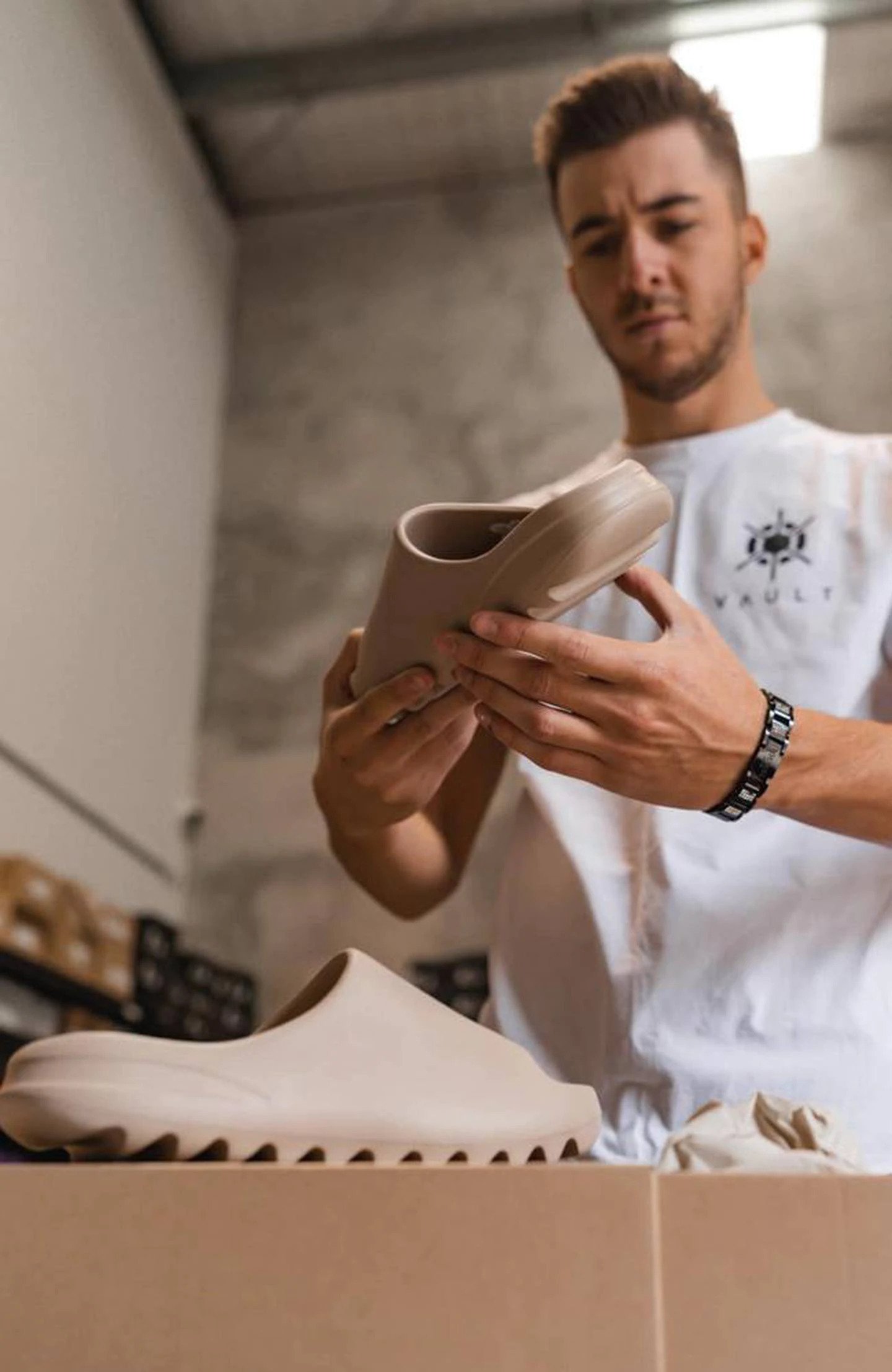 Caruccio holding a Yeezy pair of sneakers. Photo / news.com.auÂ