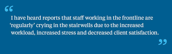 The comments, collected by union delegates from staff around the country, paint a grim picture. One union delegate said frontline staff in her branch were "regularly crying in the stairwells due to the increased workload, increased stress and decreased client satisfaction".