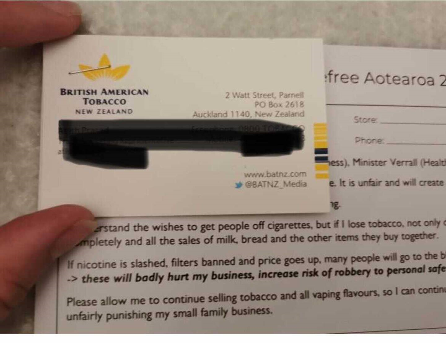 The British American Tobacco employee whose business card was attached to the postcards that were sent to dairy owners declined to comment when contacted by the Herald.