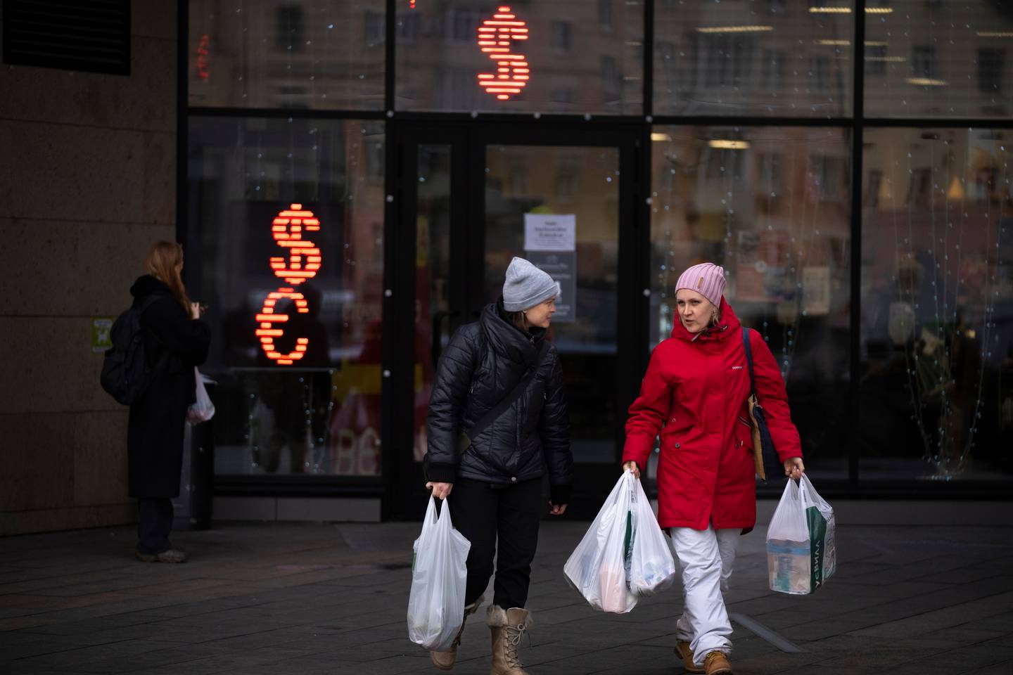 Two women walk past a currency exchange office screen displaying the exchange rates of US Dollar and Euro to Russian Rubles in Moscow, Russia, on April 1. Photo / APÂ