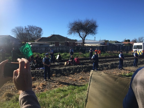 30 Extinction Rebellion activists are sitting on tracks on the corner of Garlands and Opawa roads, attempting to block a West Coast coal train travelling to Lyttelton Port.