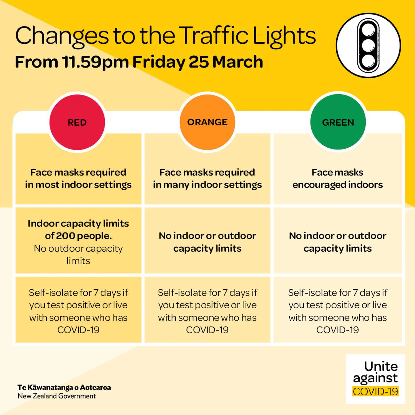The red setting under the traffic light system has also been tweaked – effective from midnight Friday – to lift capacity limits for bars and restaurants from 100 to 200 people, and to lift all caps on outdoor events.