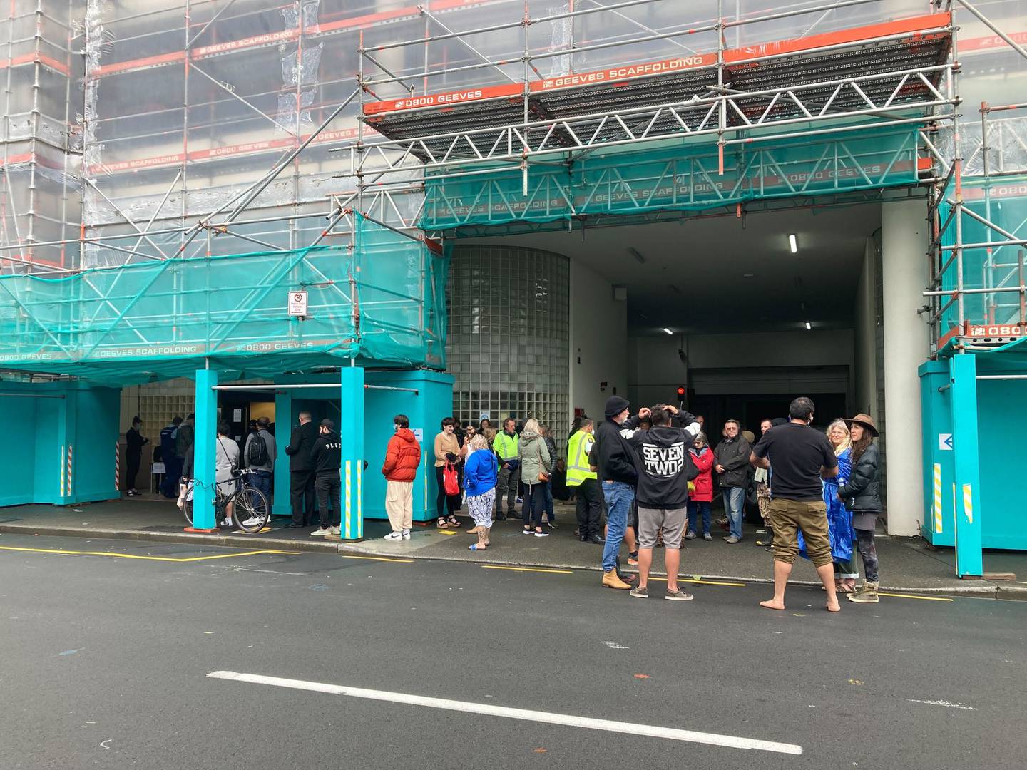 People gathered outside the Wellington District Court, some dressed in rain ponchos, where anti-mandate protesters are due to appear. Photo / Jack Crossland