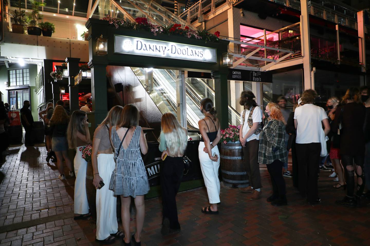 People lining outside Danny Doolans at midnight. Auckland pubs are back in business with midnight openings as NZ enters the traffic light system. Photo / Hayden Woodward
