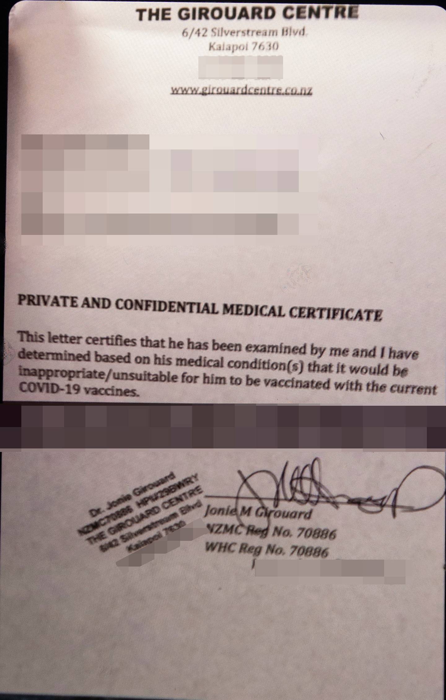 A fake Covid-19 vaccine exemption issued by Dr Jonie Girouard. Photo / George Heard