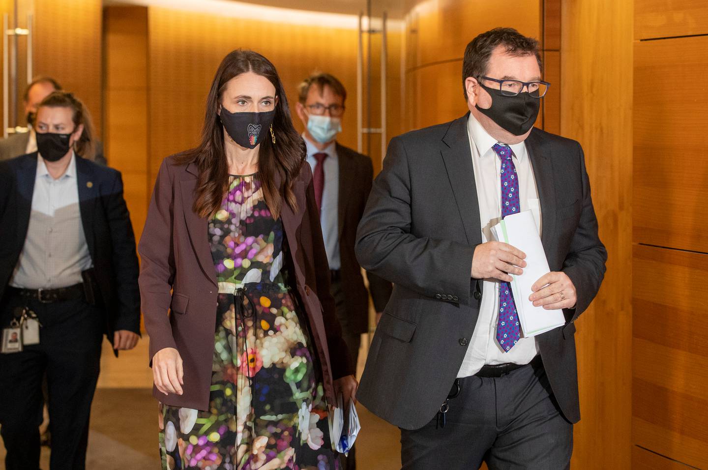 Director general of health Ashley Bloomfield follows Prime Minister Jacinda Ardern and Deputy Prime Minister Grant Robertson. Photo / Mark Mitchell