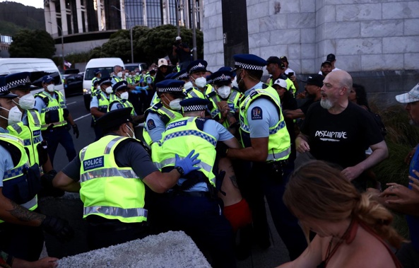 Covid-19 Omicron: Police and protesters are facing off this morning in two streets near Parliament. Video / NZ HeraldÂ