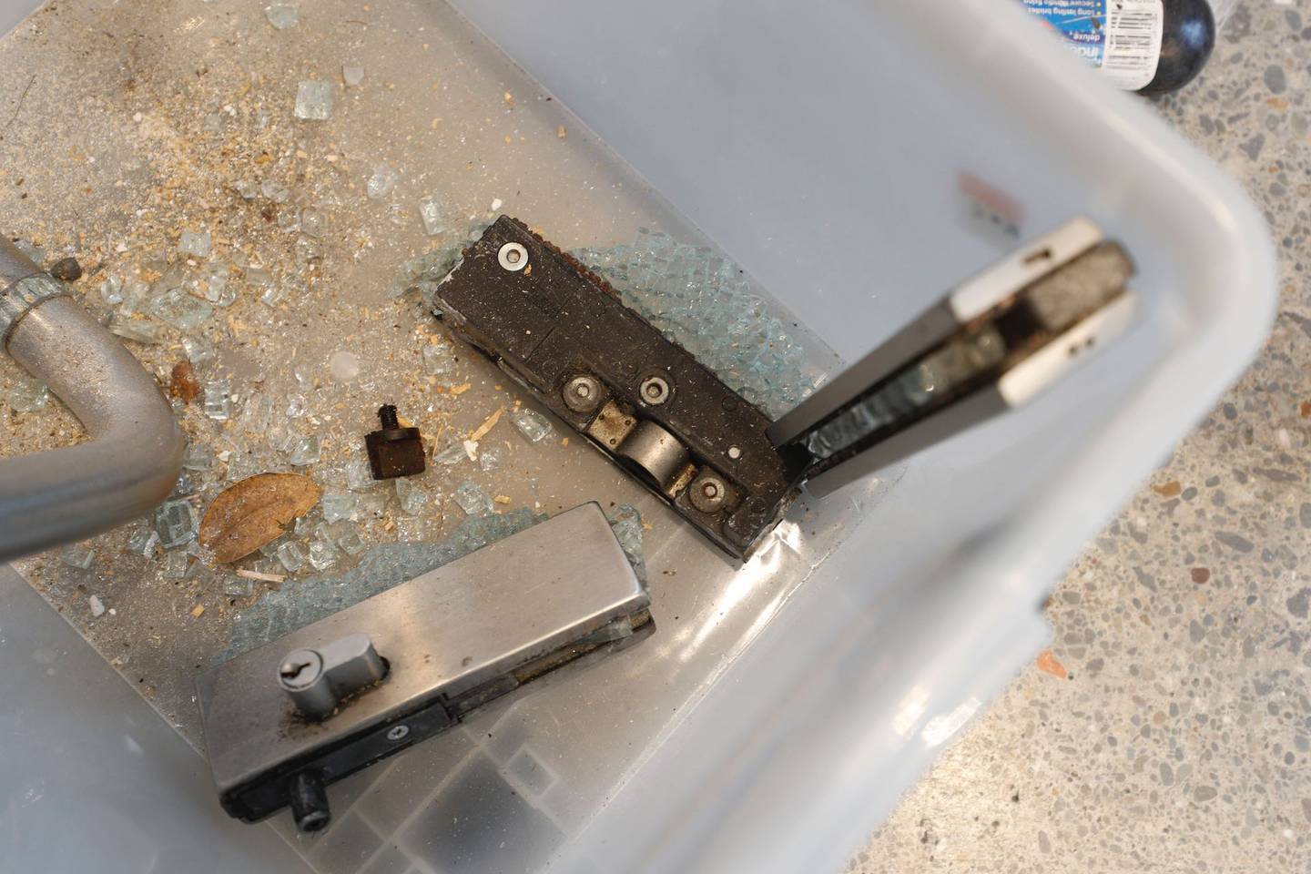 The window was boarded up yesterday. But this morning, a group arrived in a different car and a person broke in again with a device which was designed to shatter glass.Â