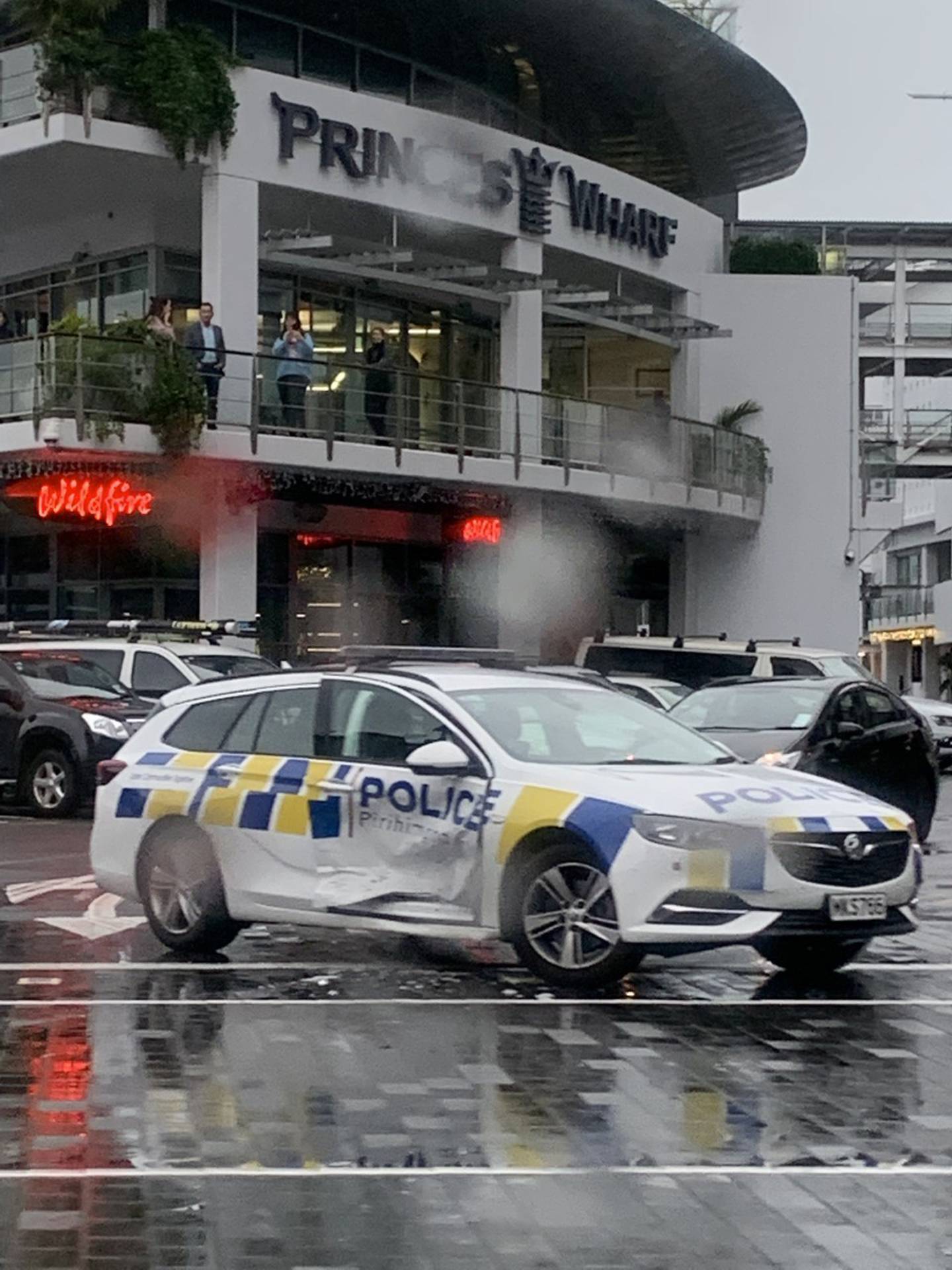 It show the blue car driving away from Princes Wharf towards an intersection going up to Hobson St.
