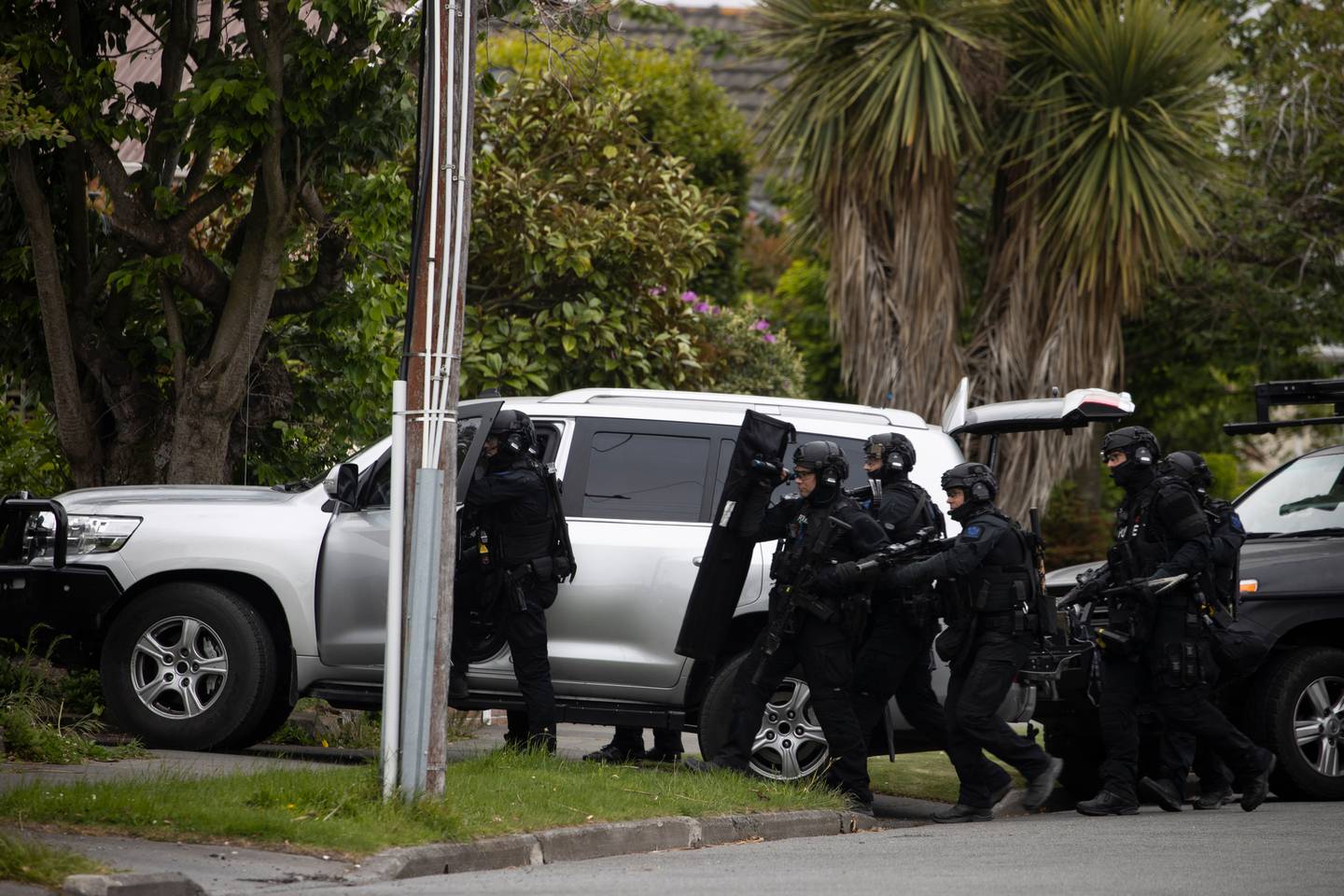 Police and armed offenders squad members raid a house on Dunster St Christchurch. Photo / George HeardÂ