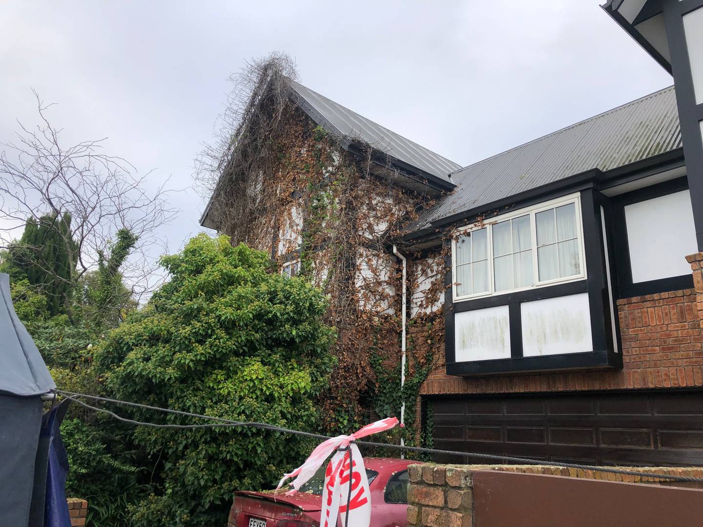 The house and exterior fence are engulfed in ivy – some windows are covered.Â