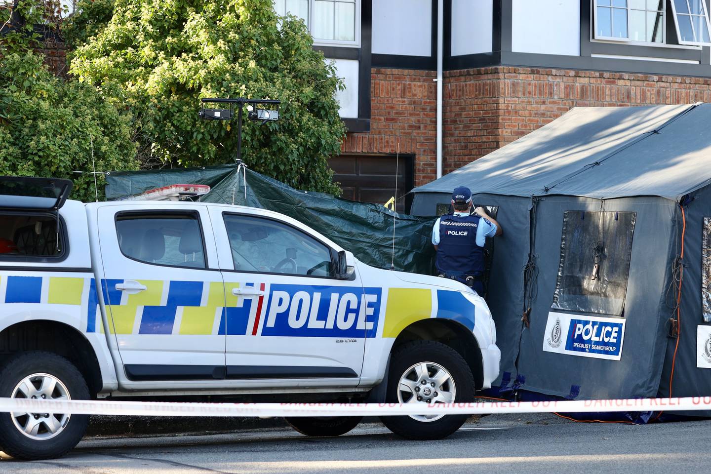 Police at the scene of the double death in Christchurch. Photo / George HeardÂ