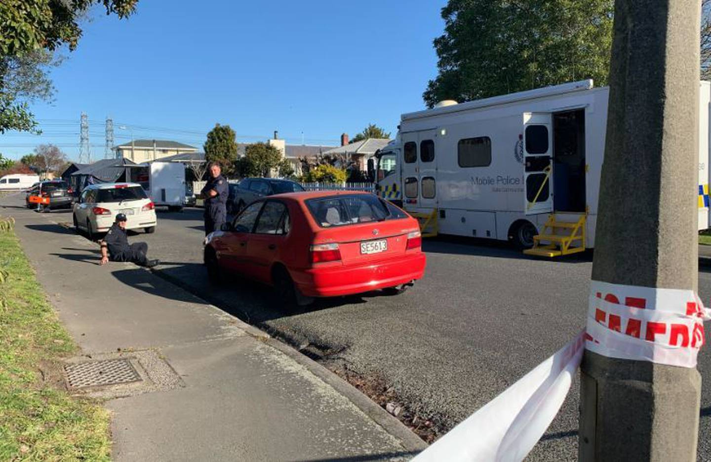 The Sockburn street is blocked off by a wide police cordon while forensic officers in both blue and white boiler suits scour the scene. Several police tents have been erected in the footpath, spilling into the street.Â