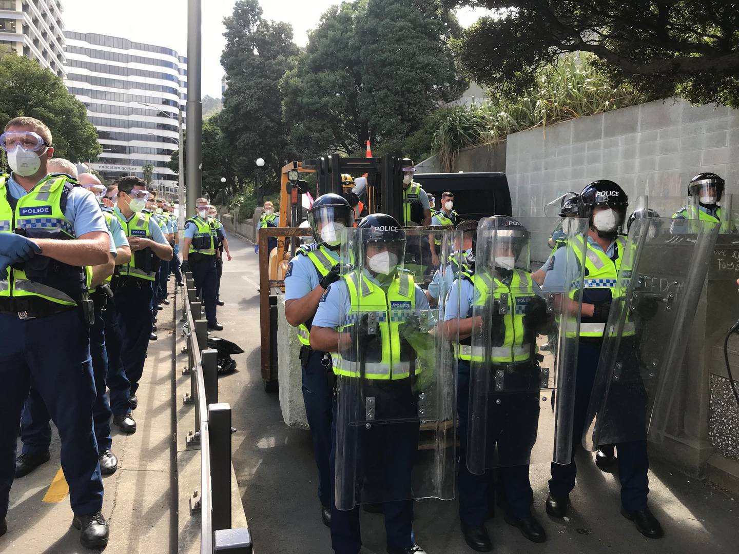Riot police appeared to be heading back to base but turned around and have again congregated at the two bollards blocking the left turn from Bowen St onto Lambton Quay.Â