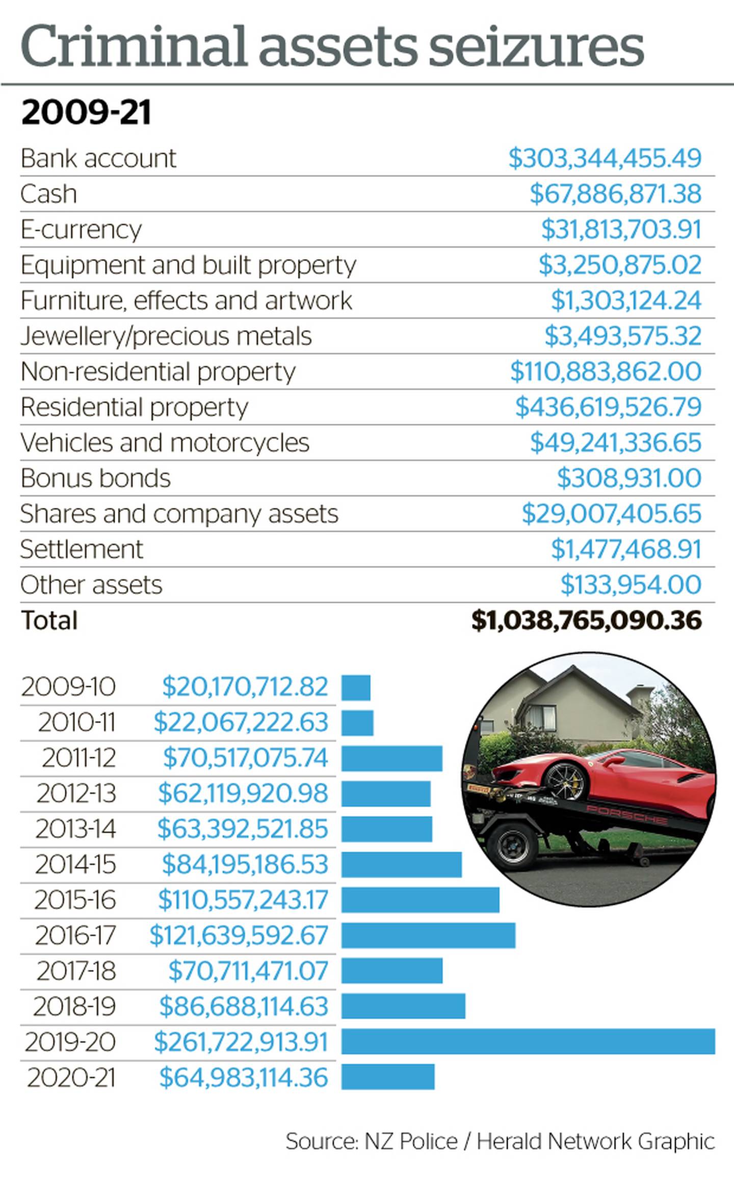 The success of the New Zealand police in enforcing the law was "impressive", according to a report published last year by the Financial Action Task Force (FATF), which estimated 8 per cent of criminal profits were frozen each year. The global average is around 2.2 per cent.