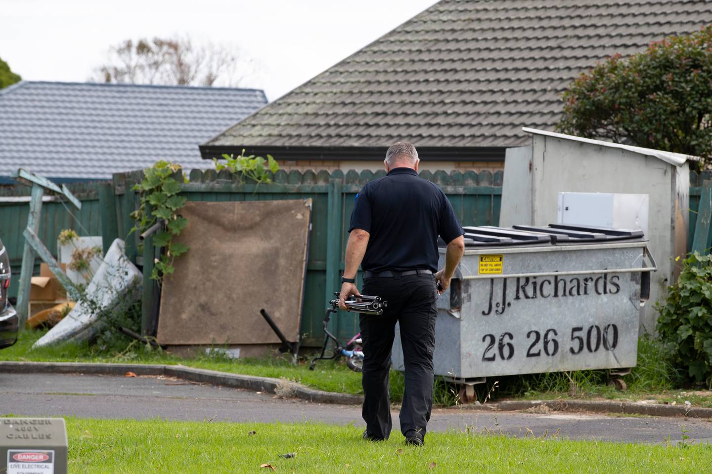 Photos from the scene show broken washing lines and overgrown lawns, with mattresses, bikes and boxes stashed down the side of the property.