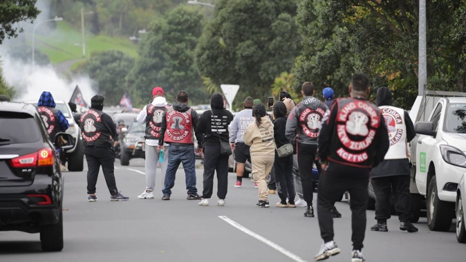 Hundreds of gang members gather for William ‘Bird’ Hines’ funeral in Foxton, large amount of police deployed. Photo / Bevan Conley