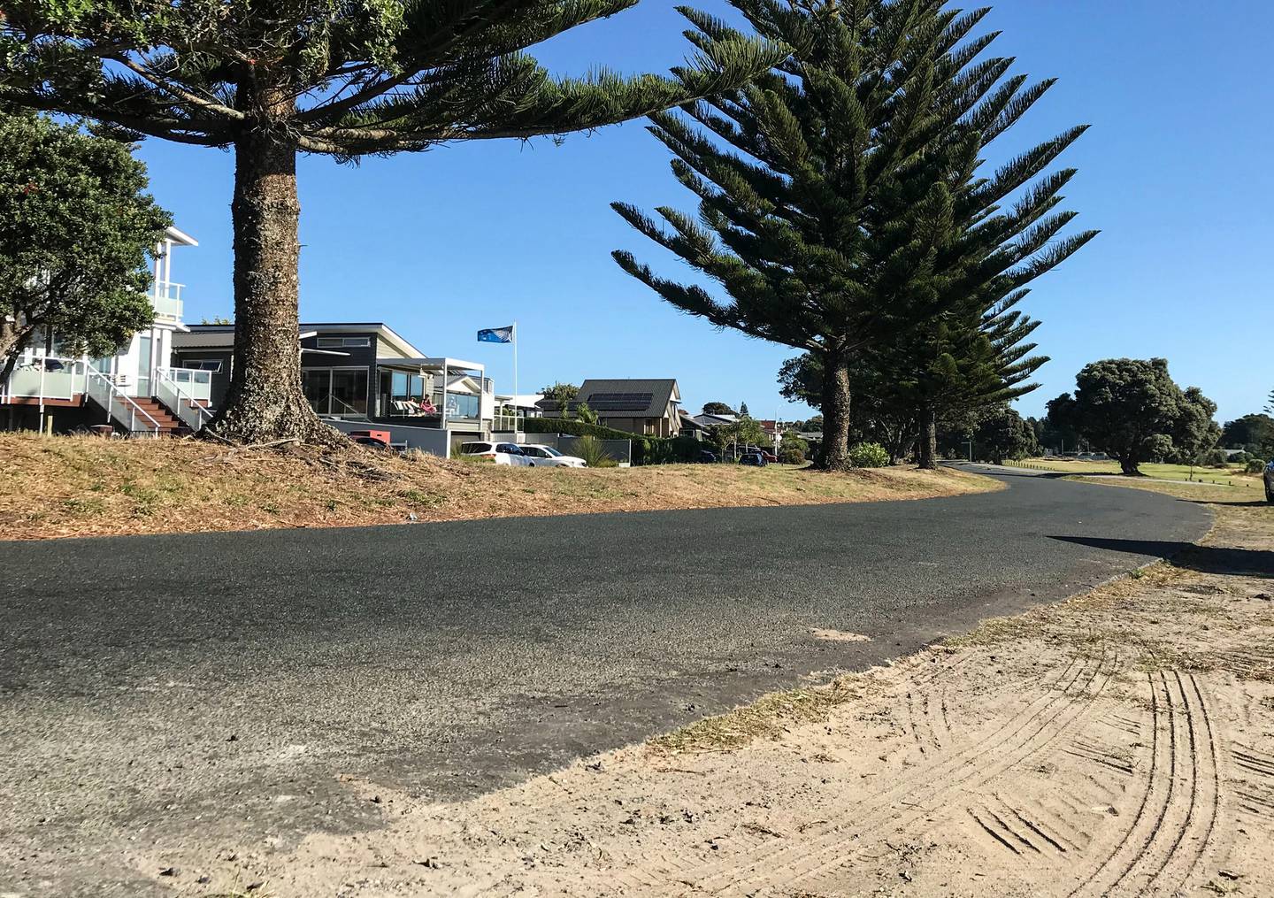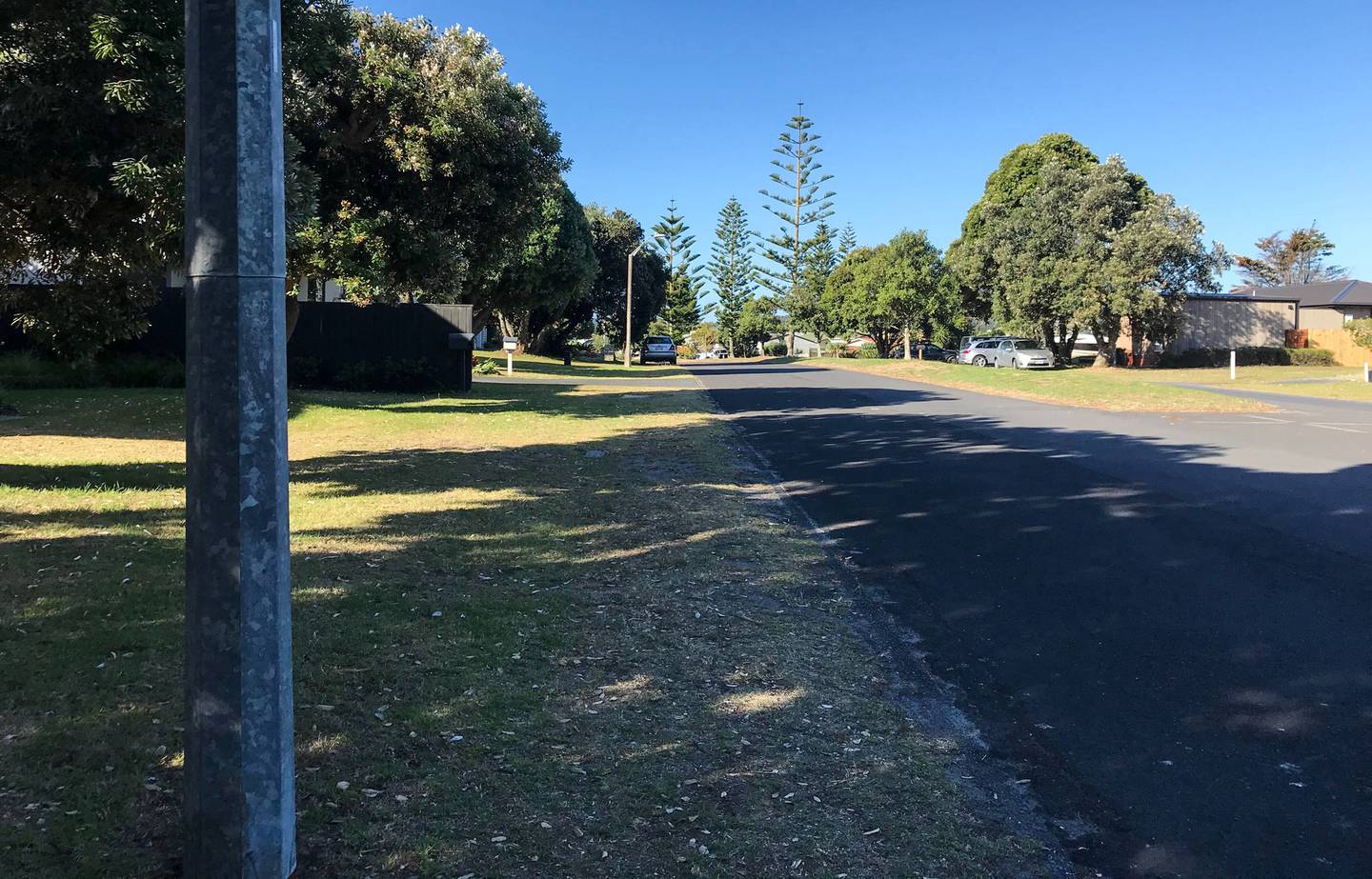 The North Auckland seaside community is a short drive from Matakana, typically busy over the Christmas and New Year period with holidaymakers. A grass median with big trees runs down the centre of Omaha Drive.