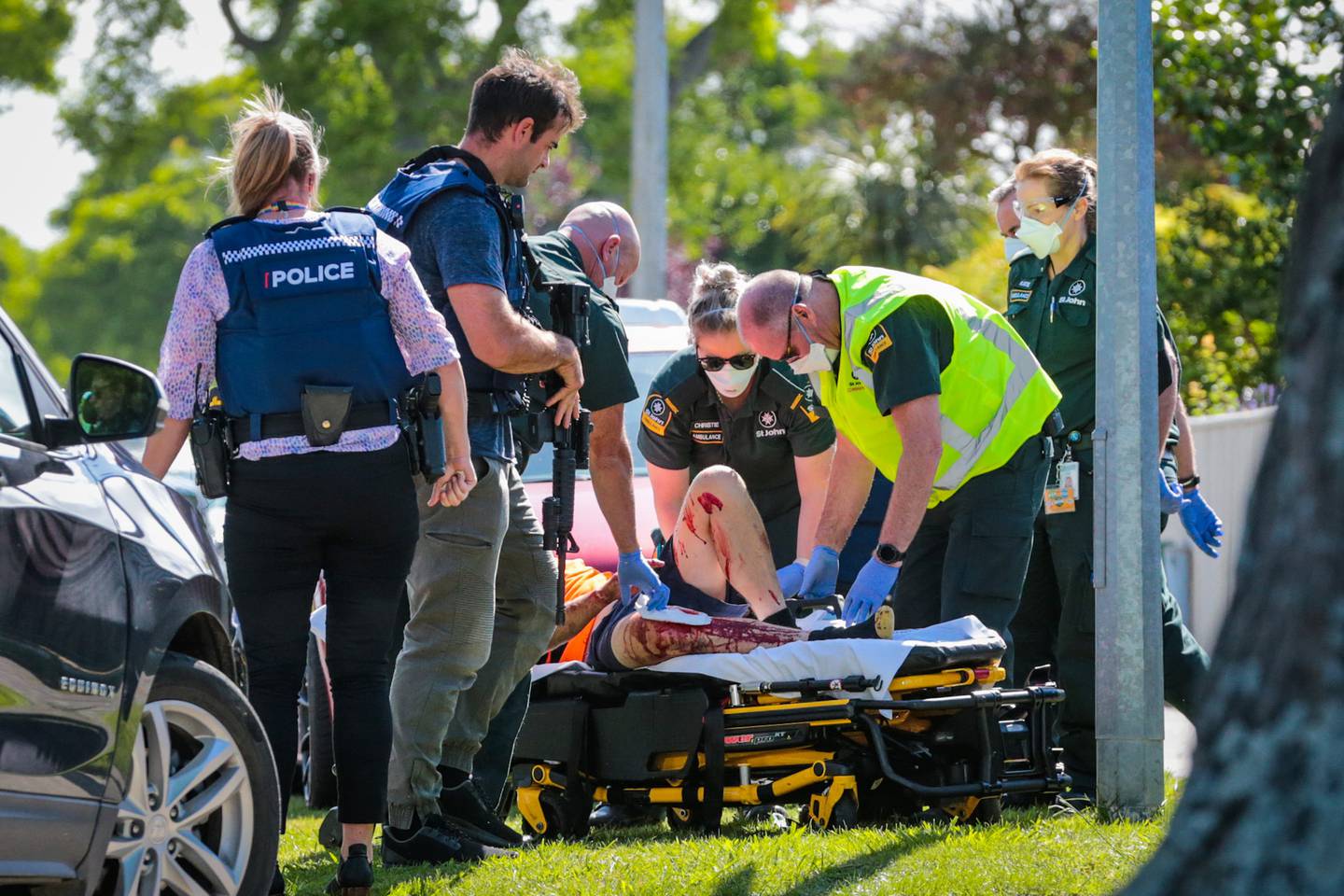 Emergency services tend to the injured man after he was helped from a Nuffield Ave home by police. (Photo / NZME)Â