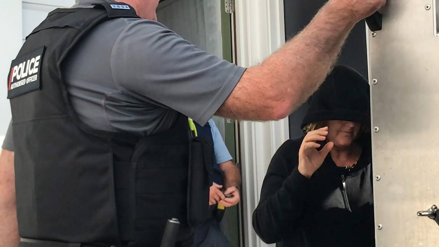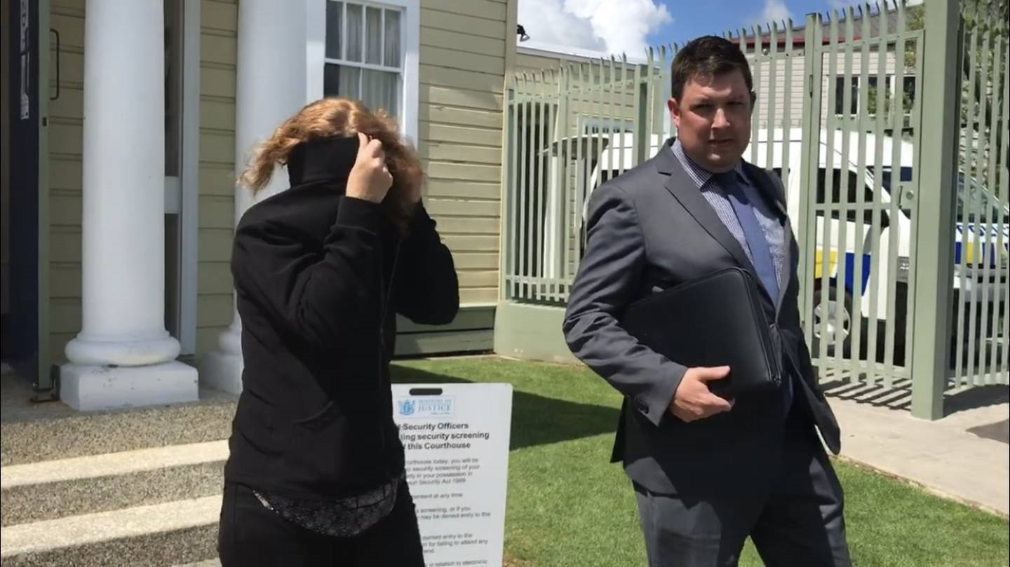 Sharon Margaret Bradley hides as she gets into a prison wagon at the Te Kuiti District Court after being jailed for four years and five months. (Photo / Belinda Feek)