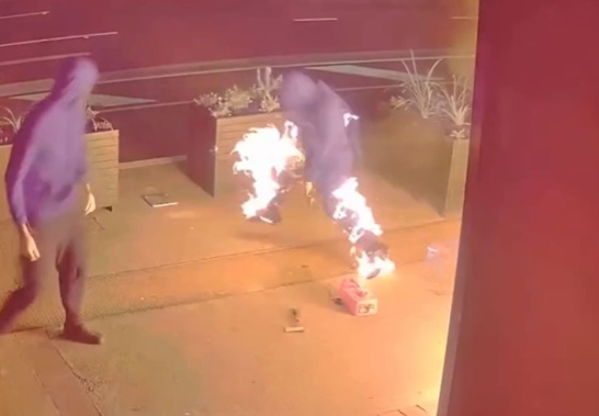 “After setting the liquid alight, one of the offenders also succeeded in setting their pants on fire, forcing them to strip their burning garments as they fled.