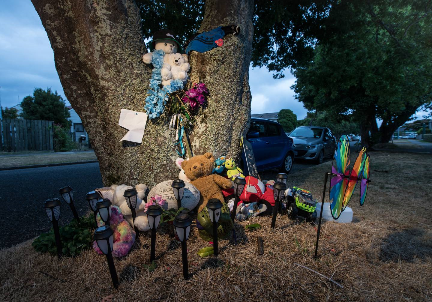 A memorial for Ferro-James Sio on a tree outside the house where he was beaten to death. (Photo / File)