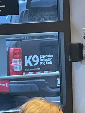 The woman’s daughter also took a photograph of the K9 explosive detector dog unit vehicle parked near the aircraft.