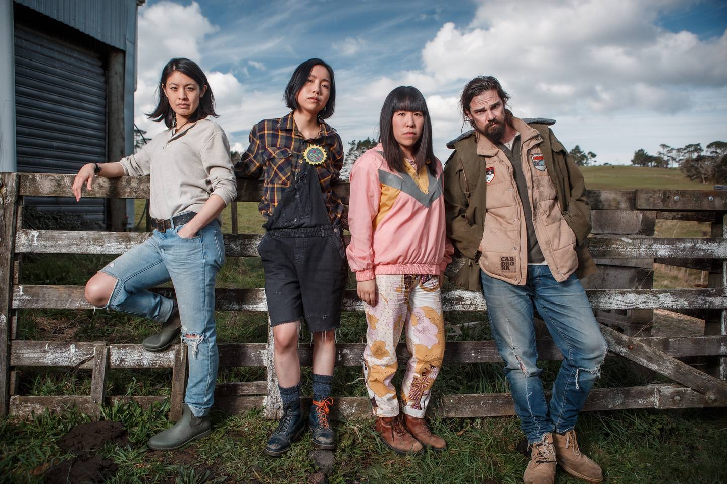 JJ Fong, Ally Xue, Perlina Lau and Jay Ryan, in TVNZ's dystopian comedy Creamerie. Photo / TVNZ