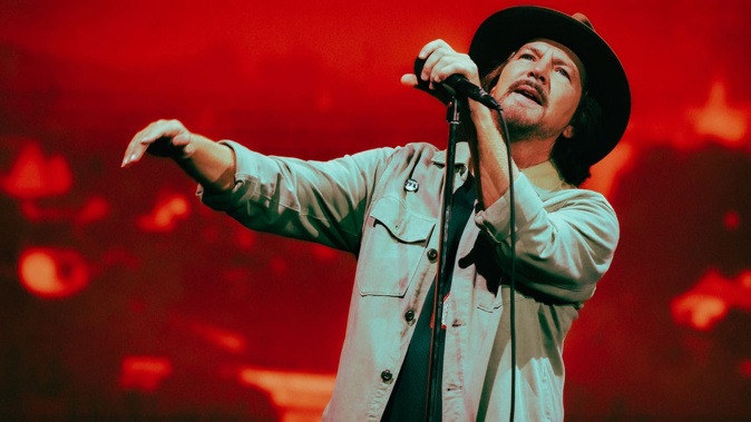 Eddie Vedder (left) on stage at Auckland’s Mt Smart Stadium for Pearl Jam’s Dark Matter tour. Photo / Tom Grut (Frog Productions)