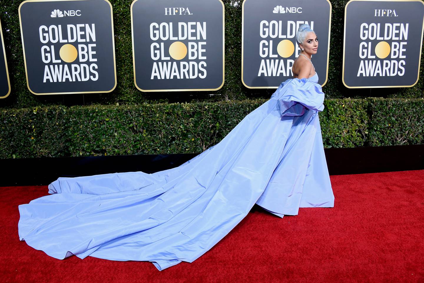Lady Gaga made an entrance with a look that kept on going. The star made a sweeping statement in 2019 when she arrived on the red carpet in a light blue Valentino haute coutureÂ