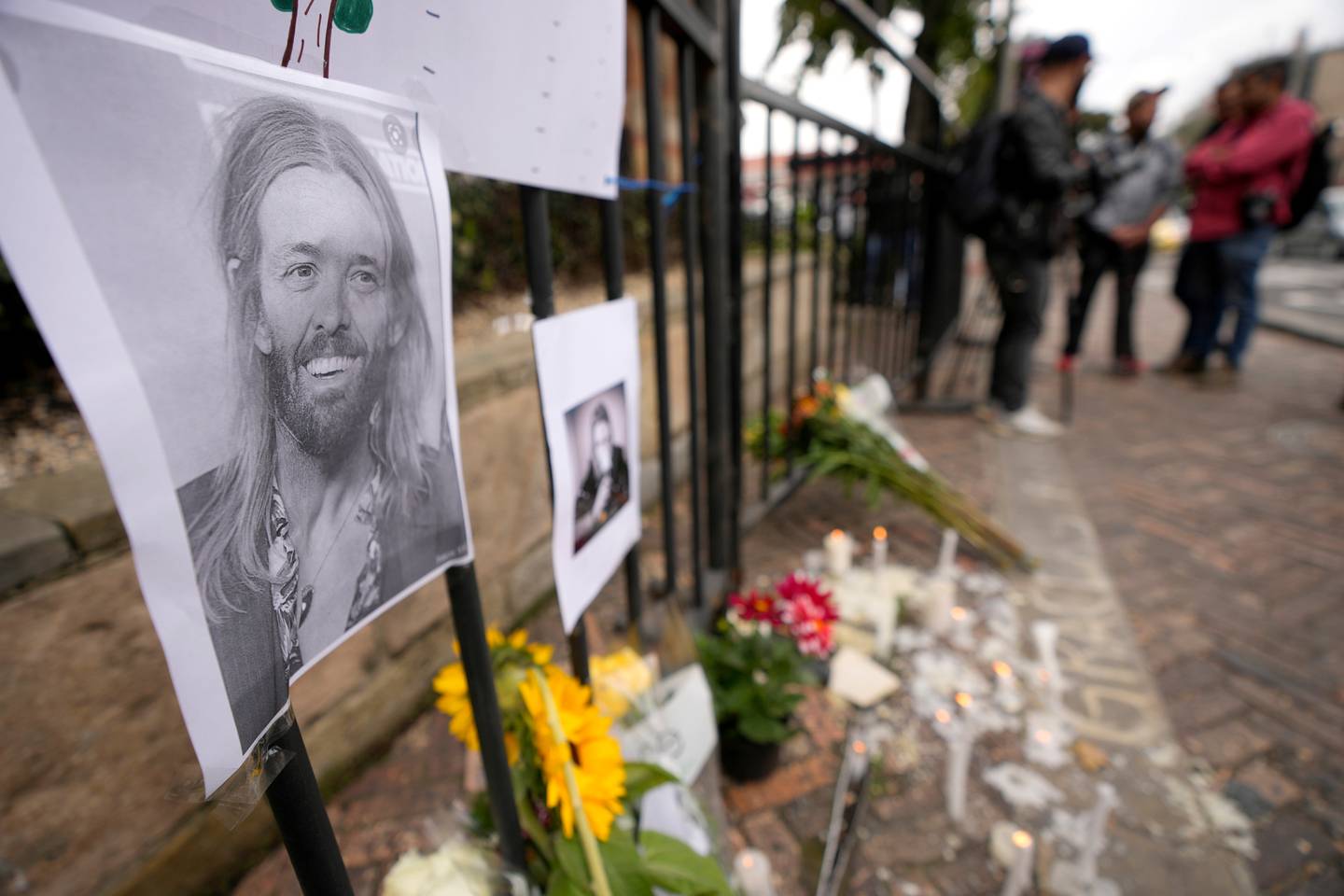 An image of Foo Fighters' drummer Taylor Hawkins adorns a makeshift memorial outside the hotel where Hawkins was found dead, in northern Bogota, Colombia yesterday. Photo / APÂ