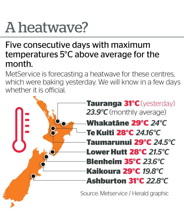 In the North Island, Tauranga, Whakatāne, Te Kuiti, Taumarunui, and the Hutt Valley were on track for a heatwave as were Blenheim, Kaikōura and Ashburton in the South Island.