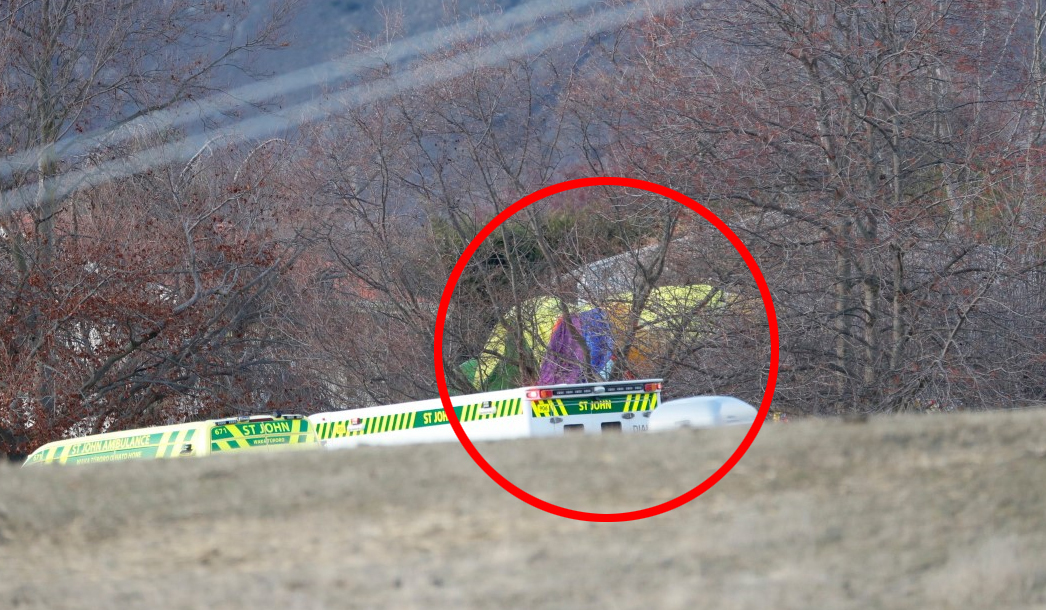 Photos from the scene show a rescue helicopter has landed in a paddock, flanked by several ambulances. A large semi-deflated balloon can be seen through tree branches. There are numerous power lines visible at the site.