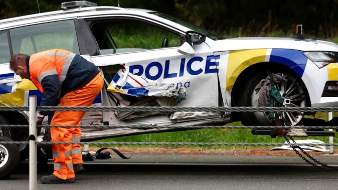 The damaged police car was towed from the scene just before midday. Photo / George Heard