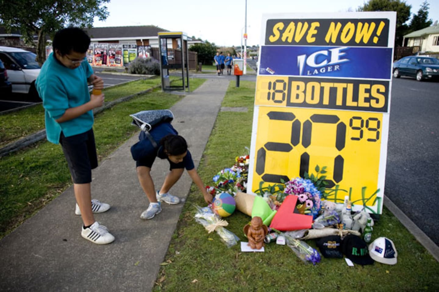 Local kids add to Navtej Singh's shrine outside his family liquor shop. Photo / Dean Purcell
