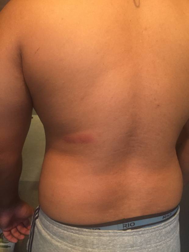 The victim said he has a welt on his back from when the officer hit an assault rifle against his back. (Photo / Supplied)