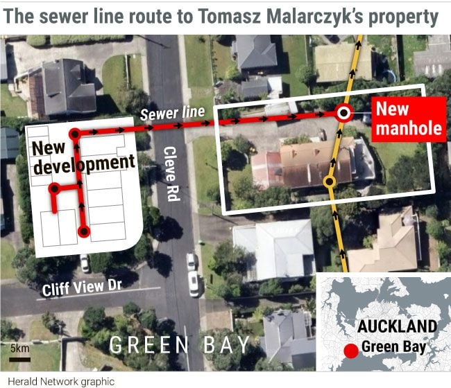 - Green Bay resident Tomasz Malarczyk says Auckland Council and Watercare gave him no say over a wastewater pipe and manhole on his property.