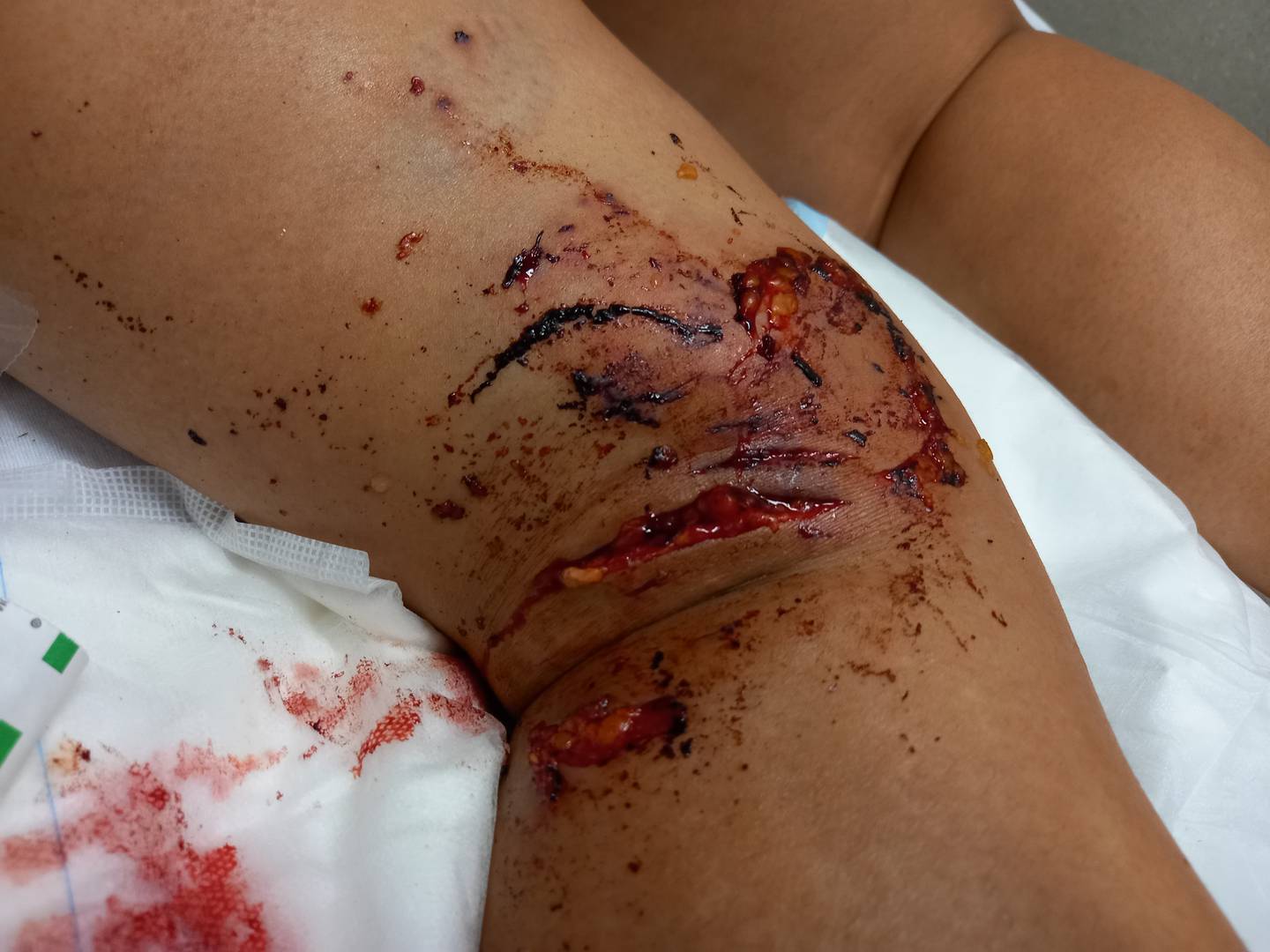 She required stitches on both her leg and ear, and her leg remains in a brace for at least ten days. She said they will return to the hospital in a week, so a plastic surgeon can assess whether there is permanent damage to her ear.Â