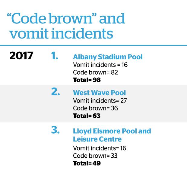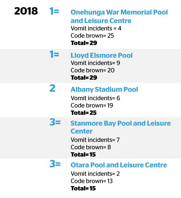 The two pools with the highest number of code brown and vomit incidents were Onehunga War Memorial Pool and Lloyd Elsmore Pool in Pakuranga.