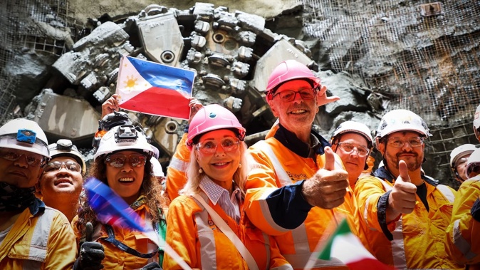 Mayor Wayne Brown underground with workers on the Central Interceptor. Photo / Michael Craig