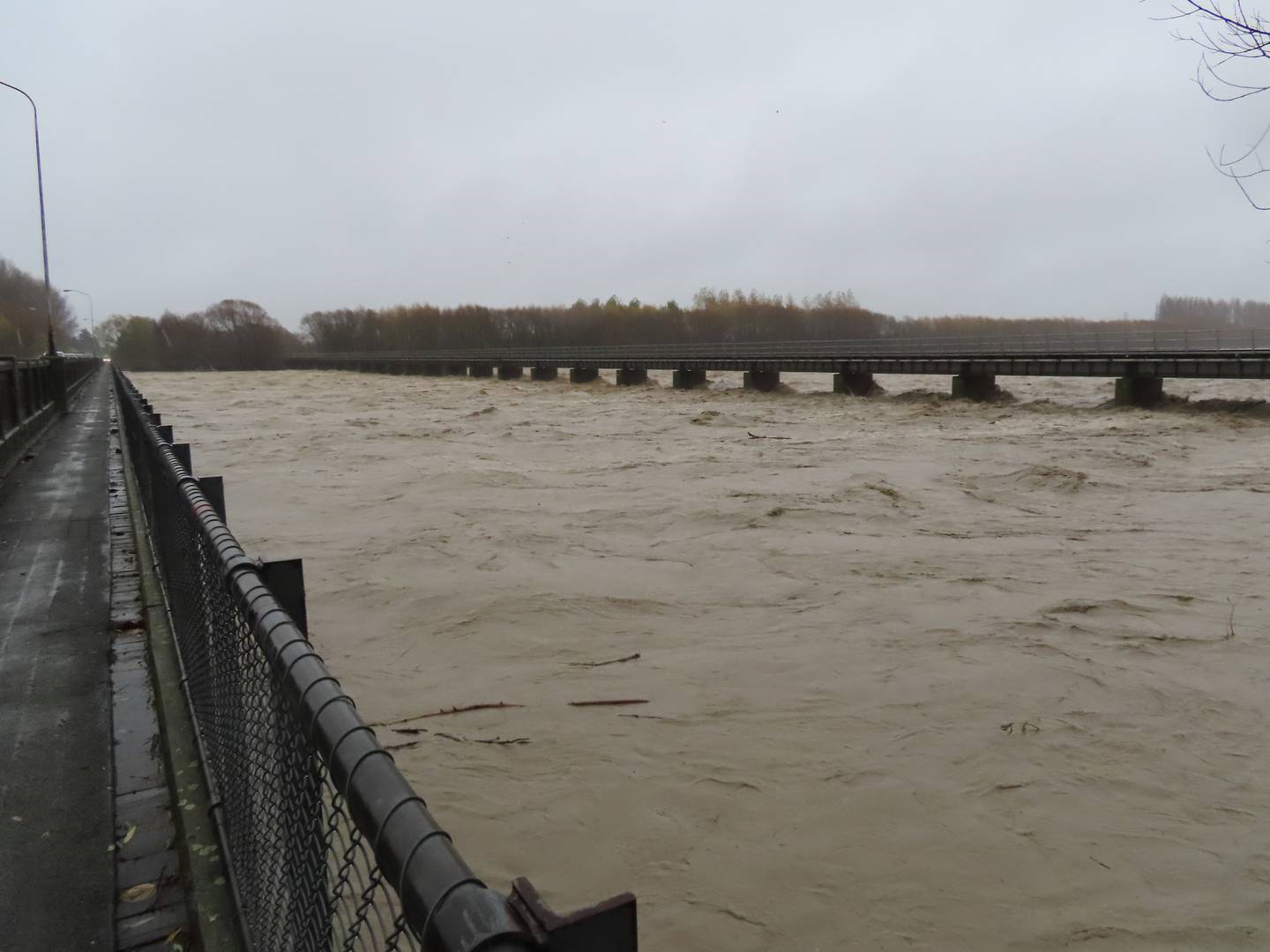 Ashburton River bridge looking upstream to the rail bridge on May 30. The bridge has been closed this morning due to slumping. (Photo / Linda Clarke, Ashburton Courier)